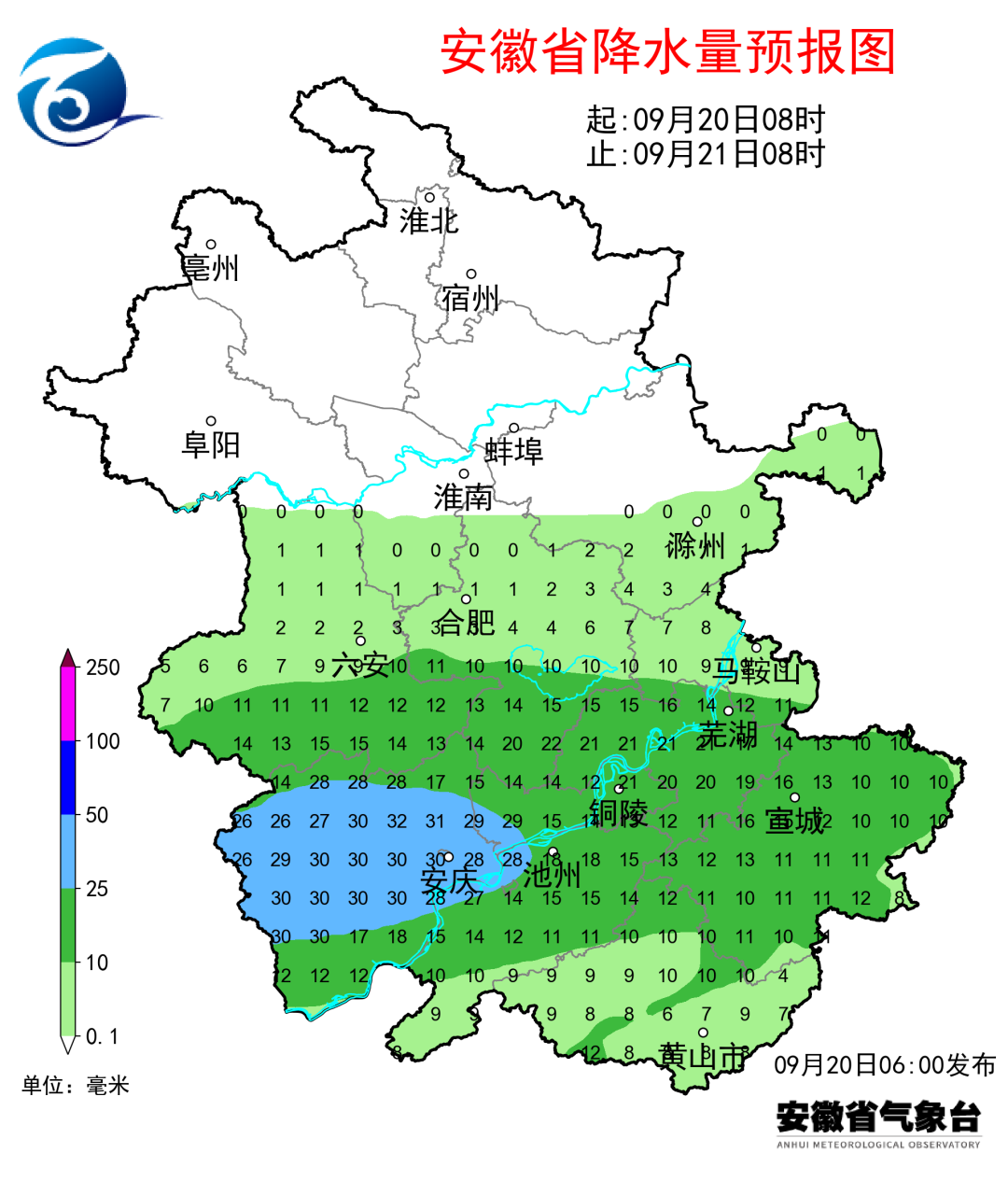 预计20日08时-21日08时,淮河以南大部分地区有降水,其中六安南部、合肥南部、安庆、铜陵、池州、芜湖、宣城等地部分地区中到大雨,局部暴雨,并伴有短时强降水和雷暴大风等强对流天气。