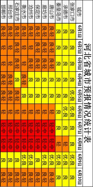 经河北省生态环境应急与重污染天气预警中心与中国环境监测总站、省气象灾害防御和环境气象中心联合会商,对2024年6月上旬(1日~10日)的空气质量进行预测,预计6日~8日,我省地面受南风影响,温度回升,中南部最高气温达35℃左右,可能出现O3轻至中度污染过程。