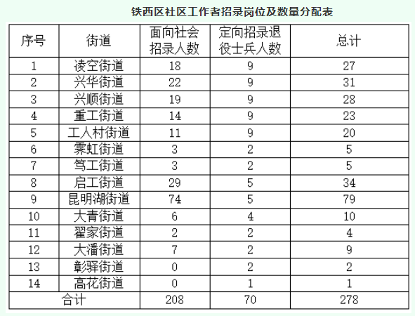 本次公开招录社区工作者278人,其中面向社会招录208人,定向招录退役士兵70人(如定向招录人员不满,从此次招考社区工作者中按总成绩由高到低递补),报考岗位以街道为单位。