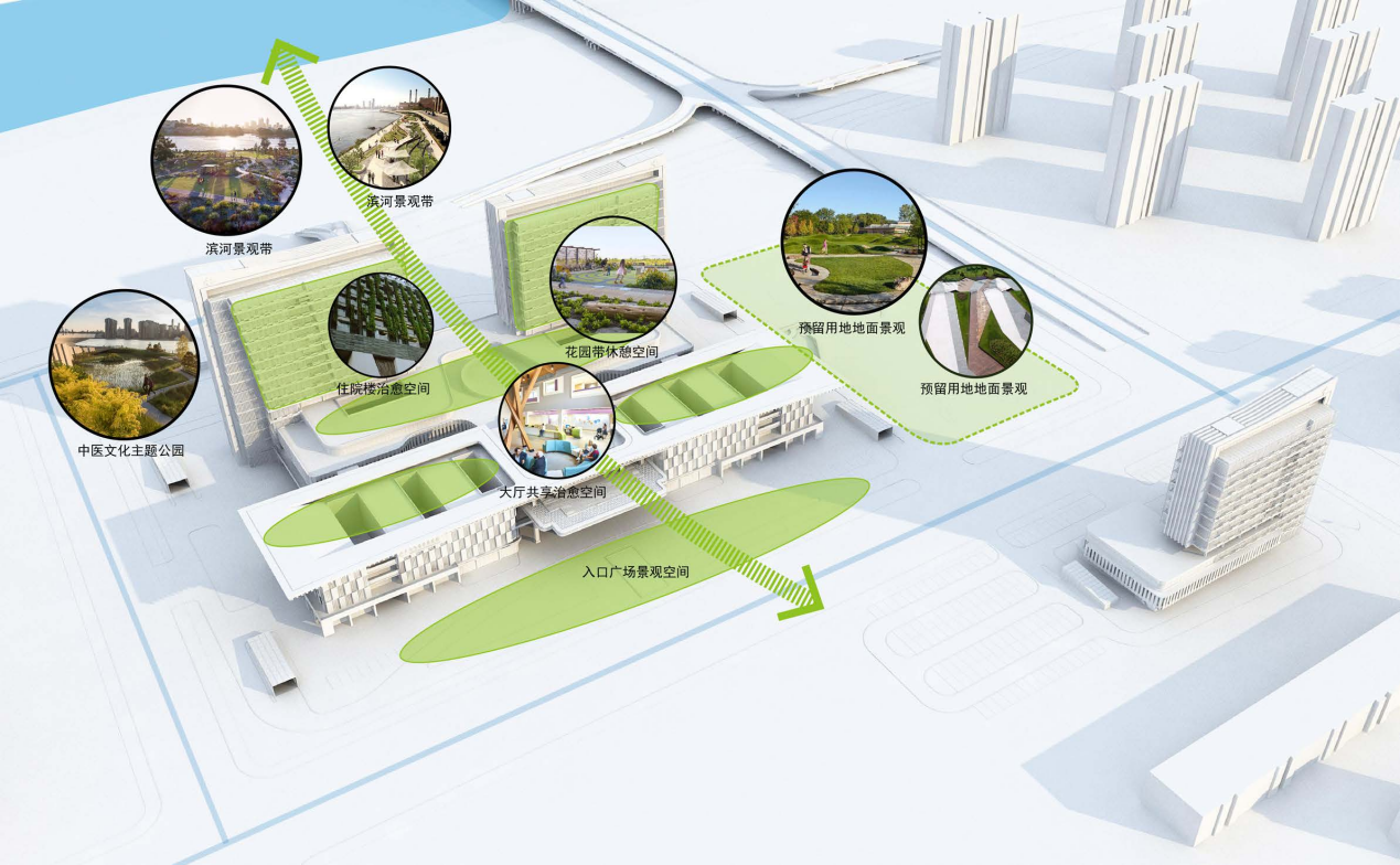 围绕院区建立高效的运转机制,既能在建筑之外有效疏导就诊患者,又能创造可达便捷的内部流线。结合当地自然文化以及中医特色,以“生态医院、绿色医院”为理念,打造院区内部浓郁的文化景观风情。医院主入口通过带有中式风情的灰空间营造,形成展开的入口景观广场,在美化医院形象的同时,提高入口的辨识度。南侧设置探视景观广场,让患者体验到“院在林中,路在绿中,房在园中,人在景中”的舒适感受。北侧通过景观布置,降低建筑对城市的影响,优化城市景观。门诊医技楼布置屋顶花园,病房楼北侧设置丰富的层间景观,创造出从地面到建筑的立体景观体系。