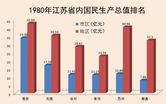 在行政区划代码里,省辖市与地区是分开排列的,省辖市之间的经济实力比拼,只看市一级。1980年,苏州市的国民生产总值(GDP)是11.89亿元,低于无锡市的17.16亿元,略高于徐州市的11.41亿元和常州市的11.23亿元。