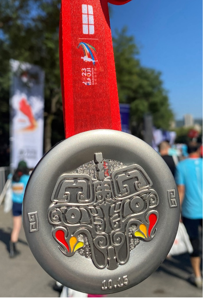 本次比赛的奖牌名为“何尊”,自发布以来,备受广大跑友喜爱。奖牌的设计灵感来自国宝青铜器“何尊”,正面采用了兽面图案,兽面三色油彩展现宝鸡世界非物质文化遗产“马勺脸谱”的特色;底纹为“何尊”内底铸铭文,记载过去,承载未来,同时将铭文中的“中国”二字显现出来,为点睛之笔;两侧耳同样取自“何尊”的祥云纹,寓意美好祥和。奖牌背面,赛事LOGO在阳光下闪亮,寓意跑者在竞技之路取得更好成绩、奔向健康美好生活;凤凰展翅翱翔,体现宝鸡城市活力,以及高质量发展。