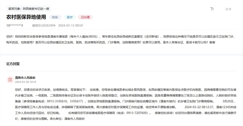 渭南市人民政府及时调查核实,对网友留言作出回复,“您母亲因病情需要住院的可在省内乡镇卫生院、一级医院、二级医院持身份证及社保卡住院并做好入院医保登记,出院在异地医院直通报销;因急危重等病情需要在三级及以上医院住院的,入院时做好异地备案,出院在异地医院直通报销。门诊报销只能在统筹区域内(渭南市域内)的乡镇卫生院门诊看病报销。”