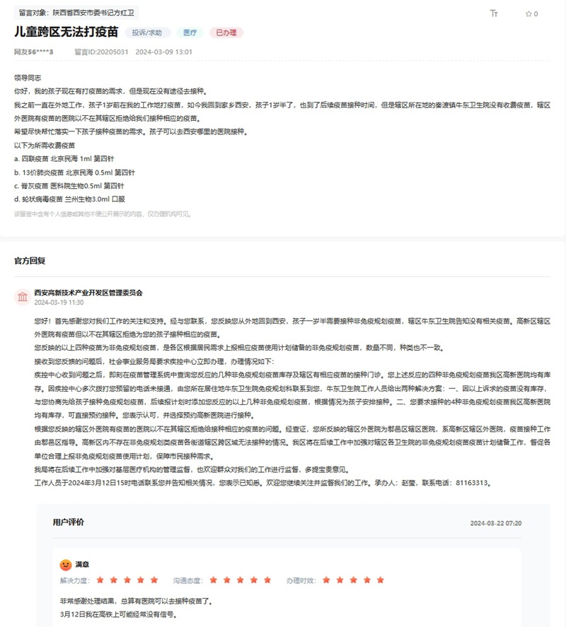 收到留言后,西安市高新区社会事业服务局要求疾控中心立即办理,即刻在疫苗管理系统中查询网友反映的几种非免疫规划疫苗库存及辖区有相应疫苗的接种门诊。