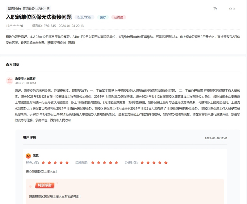 西安市人民政府回复称,如参保职工当月与企业形成劳动关系,可携带职工的劳动合同、工资流水到政务大厅医保窗口办理补收2024年1月相关医保费业务,高陵区医保局工作人员已于2024年1月26日为该网友办理了1月医保费用的补收业务。
