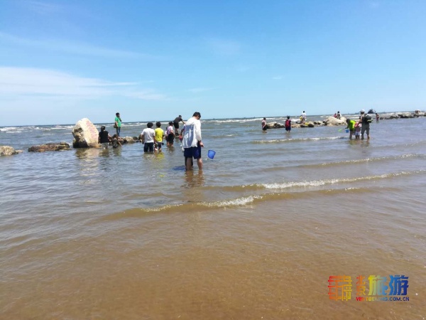 鸽子窝公园还有一项最受孩子们欢迎的游玩项目——捞小鱼。潮水褪去的时候,海滩上很多一片片的极浅的水里有很多小鱼。估计很多孩子是第一次看到这么浅的水里竟然有如此多的小鱼。