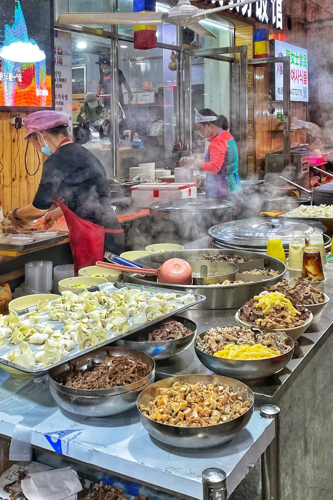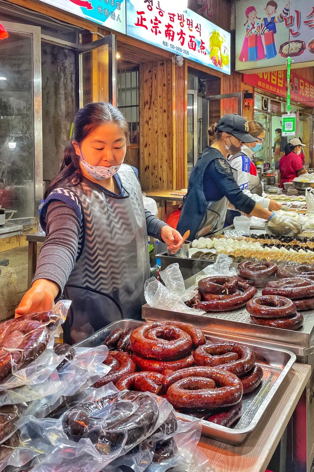 事实上,在延边,你可以找到一切你熟悉、或不熟悉,传统的、新派的朝鲜菜。其中最有特色的,要数玉米温面(可以理解为冷面的一个变种),调味均衡,入口鲜香爽弹。延边的米肠也有特色,里面放了苏子叶,除了常规的蘸着蒜酱吃,本地人喜欢拿来做汤,在早市上用小纸碗热热乎乎的盛一碗米肠汤,多大的寒气都能被驱散。