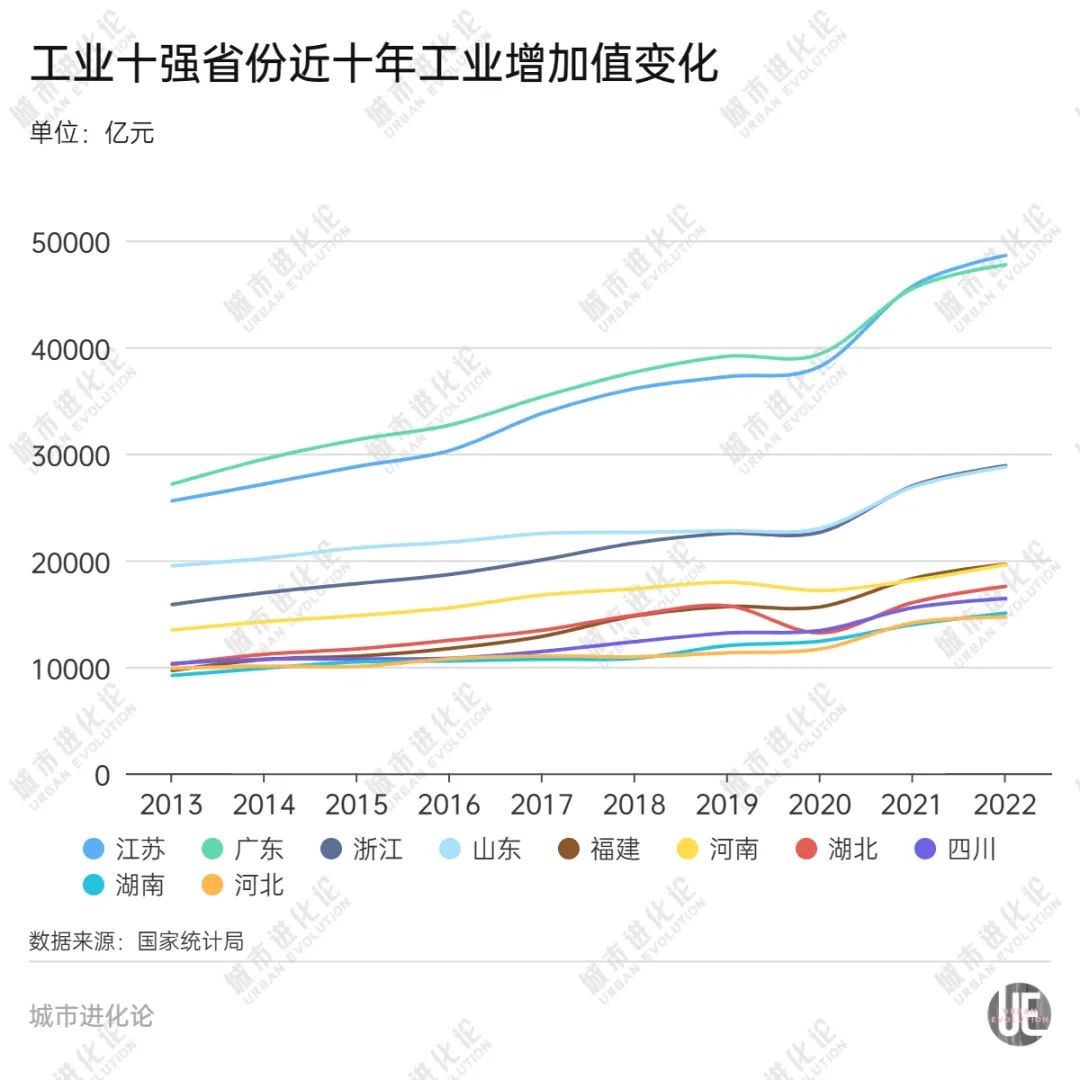 从国家统计局公布的历年工业增加值数据看,过去十年间,福建先后超越河北、四川、湖北、河南,在全国排名从2013年第九跃升至2022年第五,成为工业前十强省份中进步最大的一个。