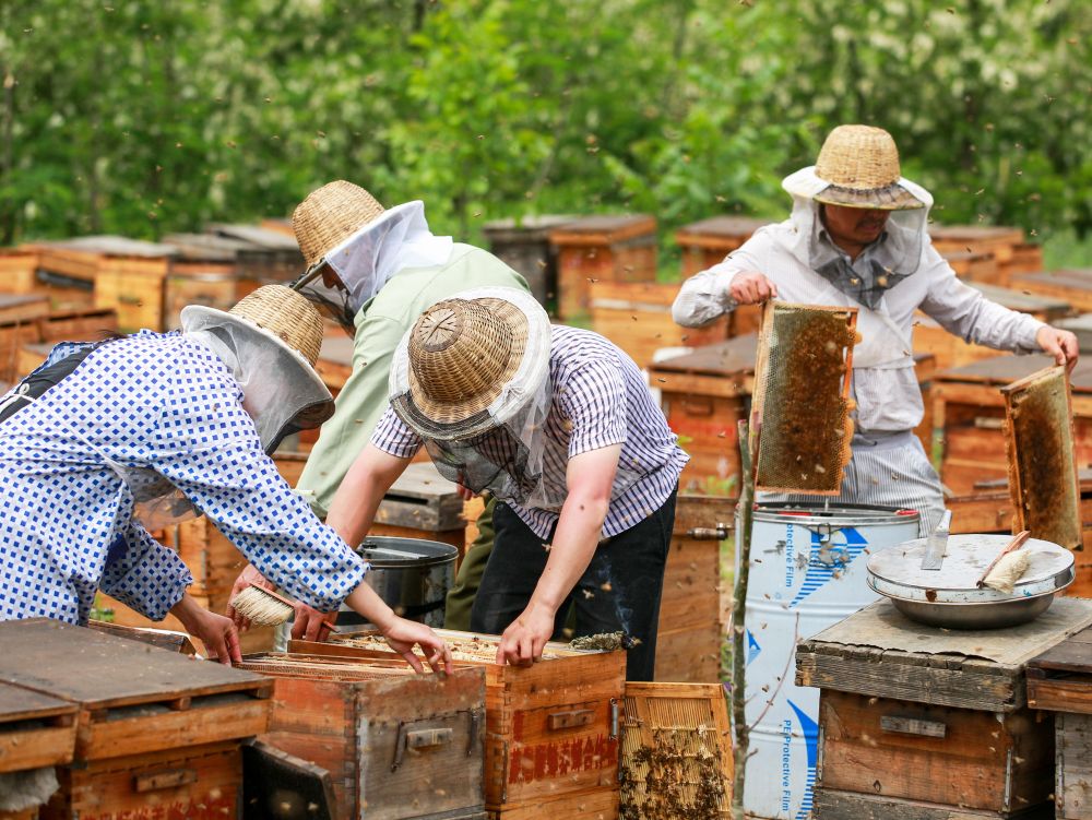 5月,是53岁的姚林东一年中最忙碌的时候。走到村子周围的树林边,只见数百个蜂箱整齐摆放,嗡嗡的蜂鸣声不绝于耳。姚林东揭开其中一个,查看采蜜情况。