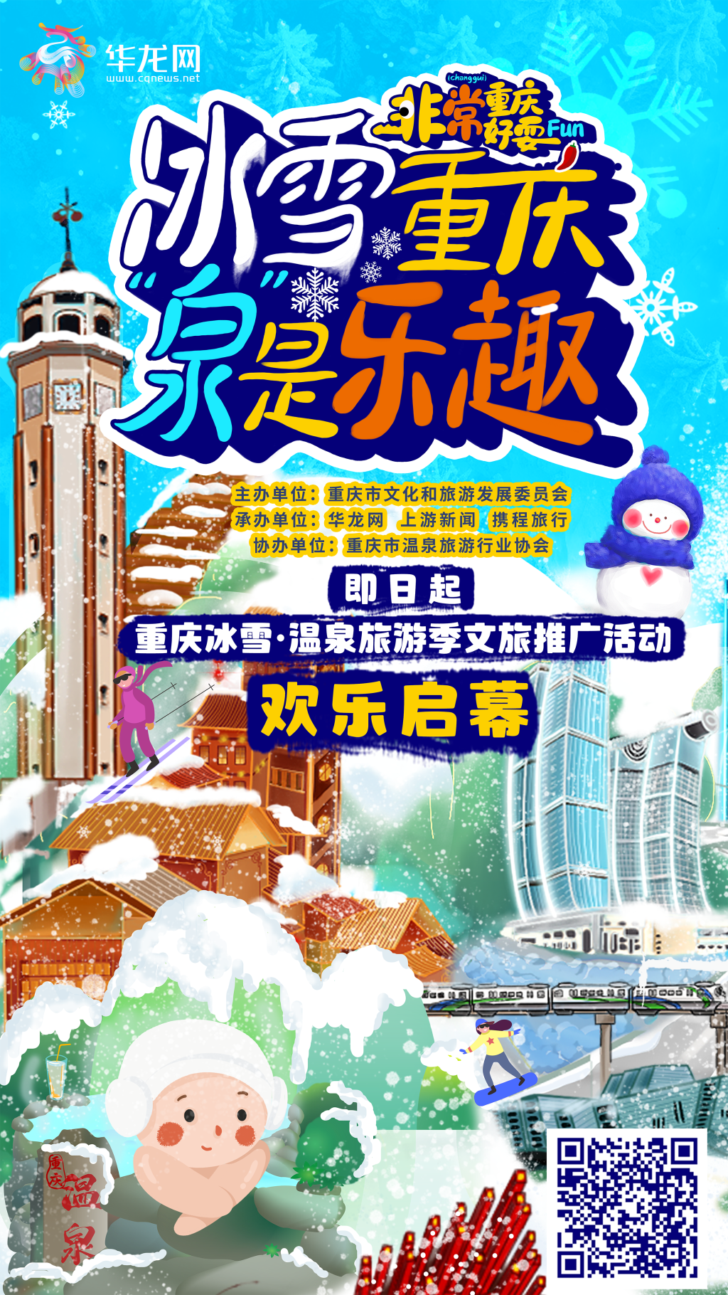 本季“冰雪重庆 ‘泉’是乐趣”主题活动,精彩多看点多。在重庆市文化和旅游发展委员会指导下,华龙网将联合上游新闻、携程旅行、重庆市温泉旅游行业协会,深挖重庆各区县温泉冰雪文旅资源,并组织旅游博主深入各区县温泉、冰雪景点打卡,为广大游客呈现冬季文旅精品。