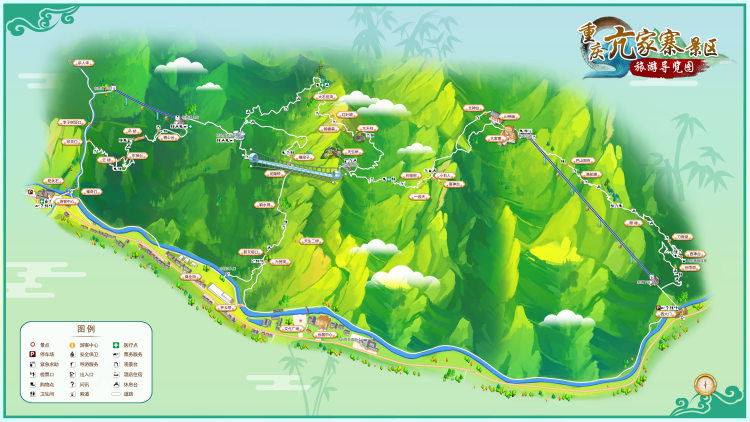 其中,核心区亢家寨景区,全程步道20余公里,分布玻璃廊桥、天生桥、亢家寨、刀背梁、依虹台等20余个景点。东大门的索道直达玻璃廊桥,西大门的索道直达亢家寨,游客可乘坐观光索道上山。