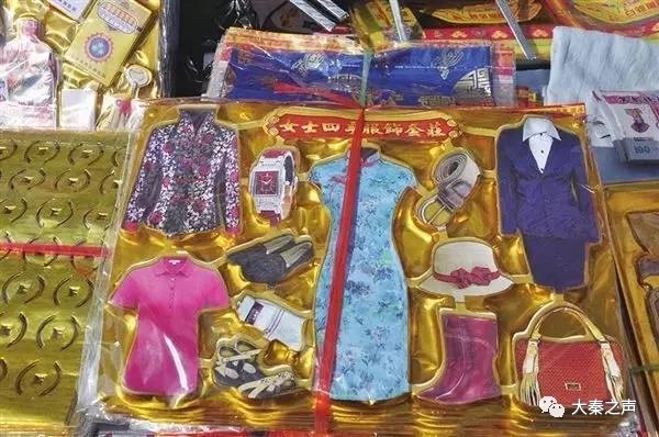 临近清明节,记者在西安市一些墓园区路边祭品摊点和商店内看到,除了传统祭祀用的冥币、纸钱之外,“豪车”“别墅”“手机”“电脑”“洗护用品”“无线路由器”“高清电视盒子”等“时髦”祭品摆放显眼,“美元”“英镑”“欧元”大行其道,抢眼坐镇,“服装超市”“吃喝超市”“珠宝大全”以“套餐”形式粉墨登场。