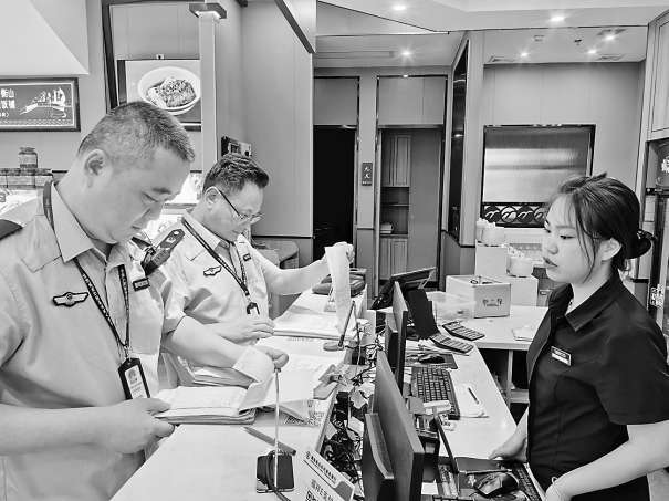 图二:执法人员检查餐饮企业食材进货台账。