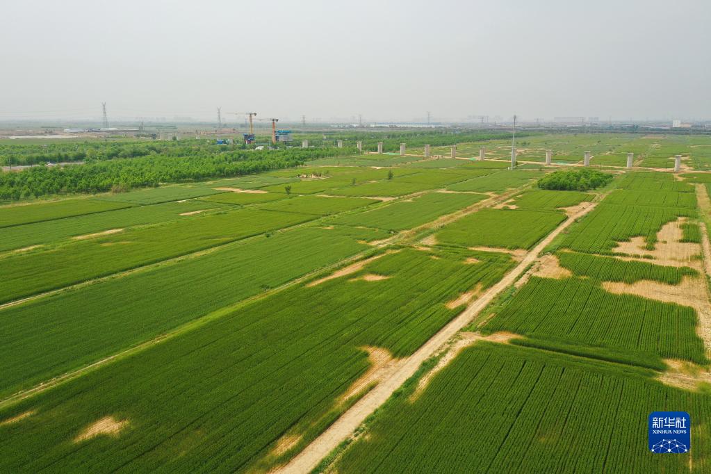 沧州渤海新区黄骅市旧城镇仙庄片区旱碱地麦田(5月11日摄,无人机照片)。新华社记者 牟宇 摄
