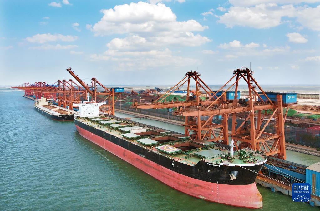 货轮停靠在沧州黄骅港综合港区(2021年8月25日摄,无人机照片)。新华社发