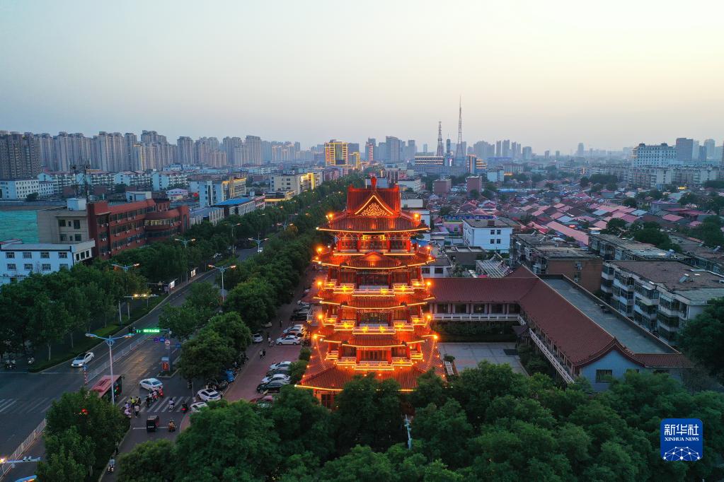 沧州市京杭大运河畔的清风楼(5月15日摄,无人机照片)。新华社记者 牟宇 摄