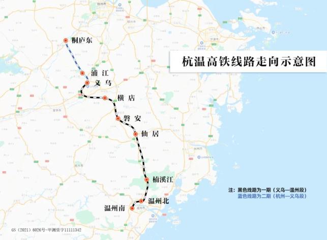 杭温高铁北起桐庐东站,向南经过金华市、台州市,到达温州市,线路全长260公里。