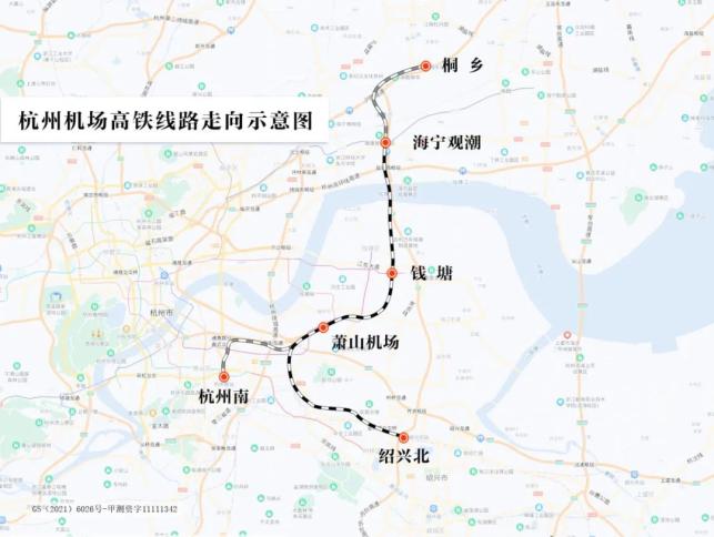 杭州机场高铁全长约85公里,途经浙江桐乡市、海宁市,穿越钱塘江后向南,经杭州钱塘区、萧山区及绍兴柯桥区,终至绍兴北站。新建海宁观潮站、钱塘站、萧山机场站,改扩建桐乡站。