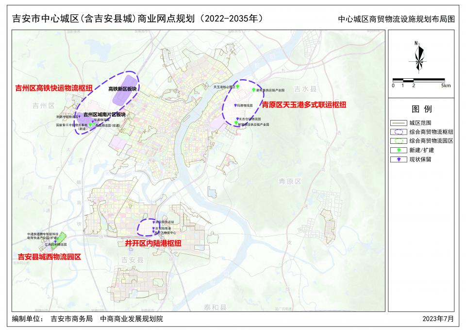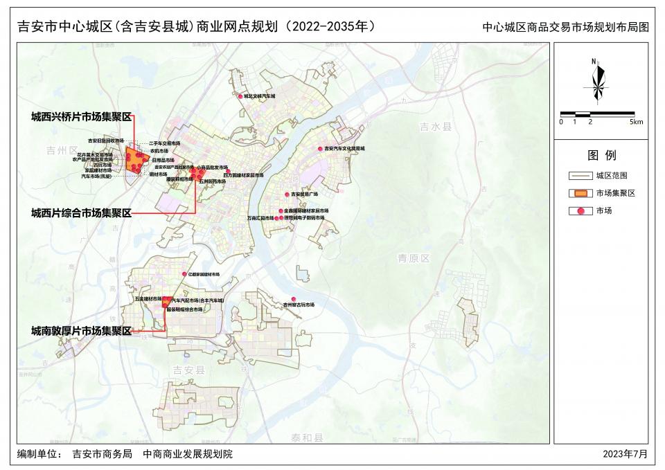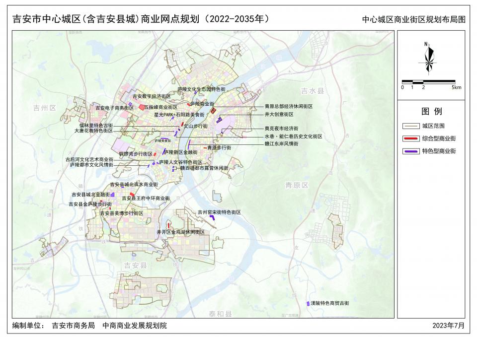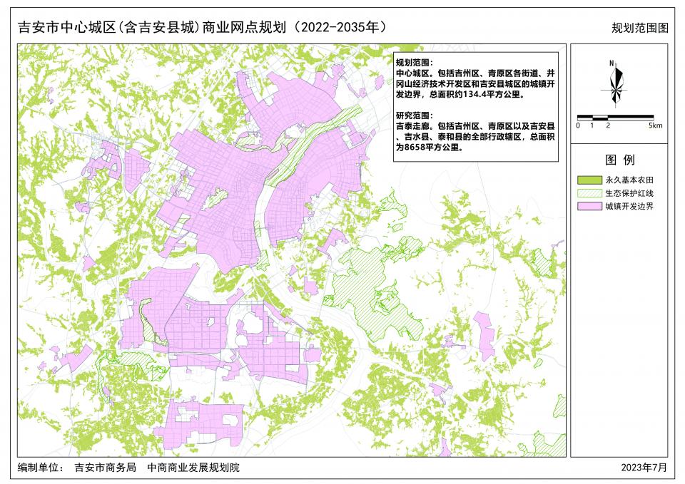 规划期限为2022—2035年。重点针对中心城区(包括吉州区、青原区各街道、井开区、吉安县城区)的城镇开发边界134.4平方公里范围内各级商业中心、商业街区、农产品零售终端、商品交易市场、商贸物流设施、相关服务网点、特色商业空间等方面提出规划引导。