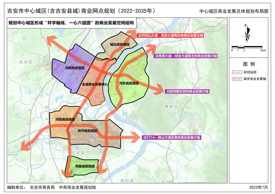 2.完善空间体系:规划中心城区形成“井字轴线、一心六组团”的商业发展空间结构,吉泰走廊形成以中心城区为核心的“一区三轴四片”的商业发展空间结构。