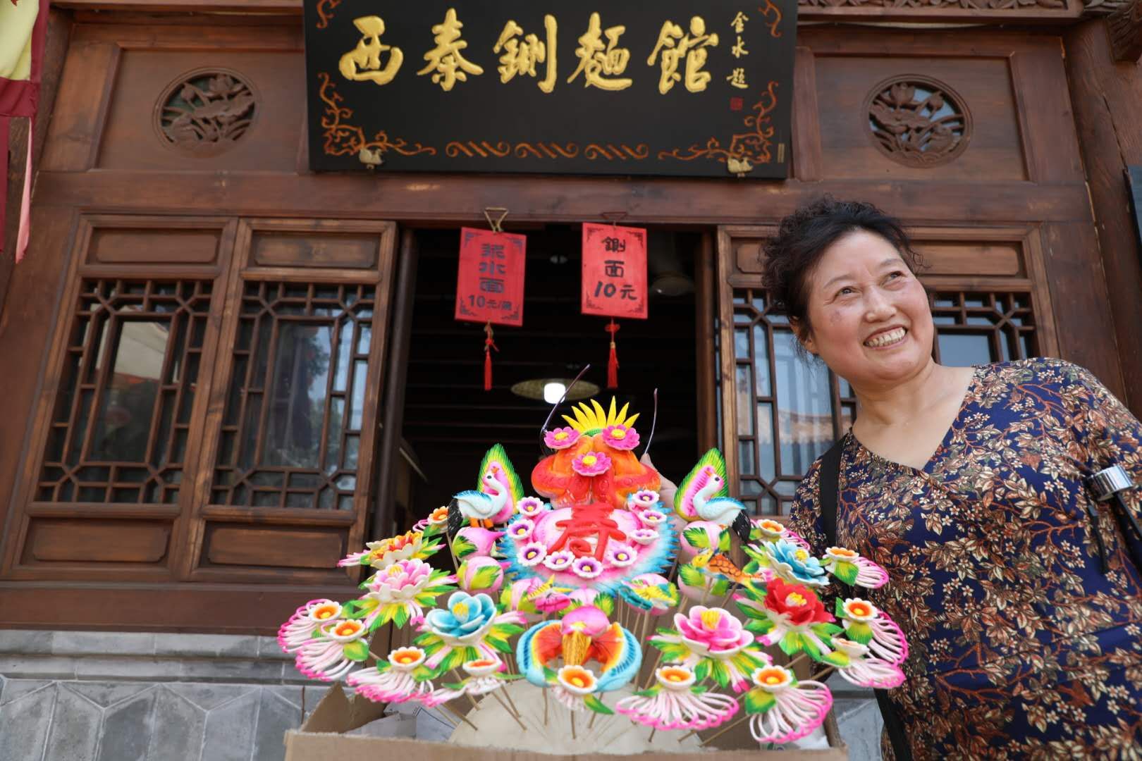 沿街店铺还有搅团、凉粉、粉汤酥肉、豆花、西秦大刀铡面臊子面、腊驴肉、酱牛肉、麻花、油糕等等,一道道美食让人垂涎三尺。特别是辣子一道菜的红润,给宝鸡味道画龙点睛。西府老街游客人流攒动,走走停停,不断驻步品尝各种小吃,传承老手艺,地道好美食,让游客吃在老街,流连忘返。西府老街,大部分美食是拥有悠久历史的“忒色”味道。从唐太宗当年食用的“血条面”,到满汉全席中的美味猪蹄,从八十岁老奶奶亲手擀的臊子面,到从小就喝的一碗豆花,从一块老点心,到一杯茯茶,从漂洋过海到来的咖啡、披萨,到年年酿制的柳林酒……迈进十三彩斗拱建制的牌坊门楼,一场盛大的美食味蕾盛宴随即开始。