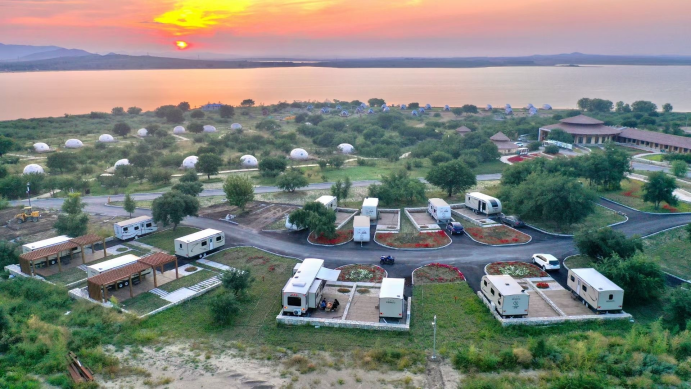 共有16辆特色房车,有适合三五好友聚会的豪华型一室一厅房车,有适合情侣入住的浪漫星空房,也有适合全家出游的家庭式房车,温馨便捷的院落式房车营地,使游客充分享受难忘的家庭时光。