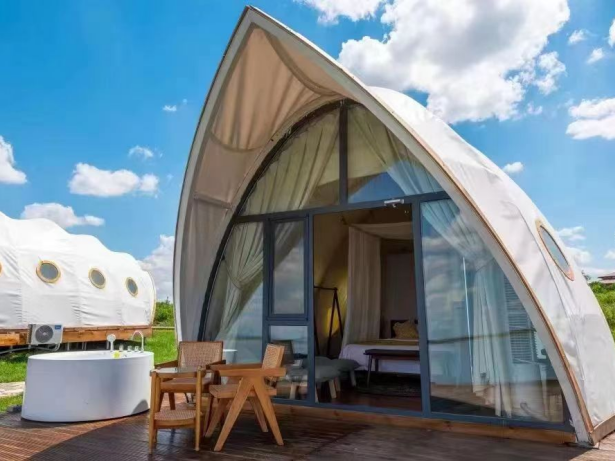 共有30处星空营地,帐篷以星空为主题,采用类椭球形的外观形态营造太空基地的场景特色。室内空间以舒适的色彩搭配及柔软的布艺家具,营造出像“巢”一样差异化的居住体验。