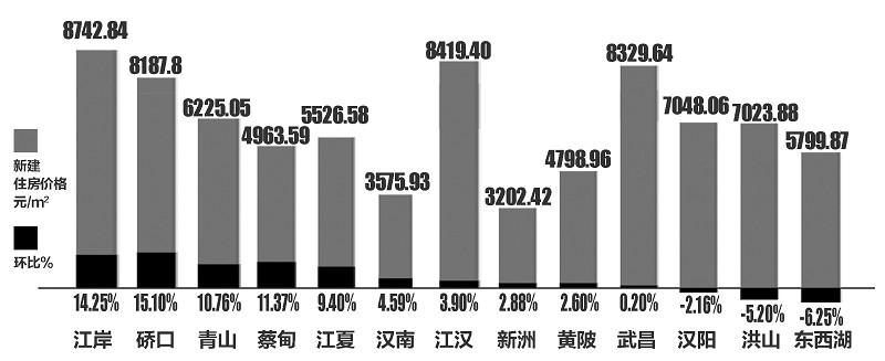 另外,一季度武汉纳入统计范围的13个区,仅有汉阳、洪山、东西湖新房价格出现了下跌,其他10个城区都不同程度地上涨,江岸、?口和青山涨幅排前三位。