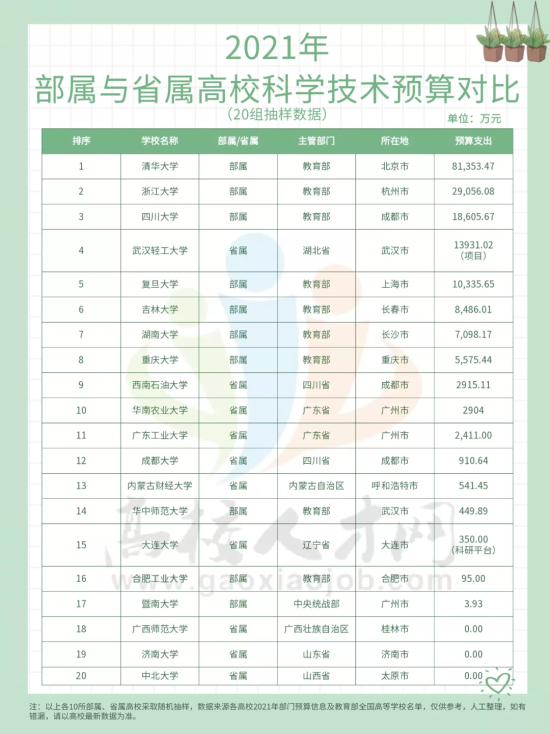 为了更直观的对比部属高校与省属高校的资源区别,高校人才网在全国2757所高校中(不含台湾省、香港特别行政区和澳门特别行政区高等学校),随机抽取10所部属高校及10所省属高校,对比其2021年度部门预算公开报告中的财政拨款、科学技术、住房保障经费等差异。