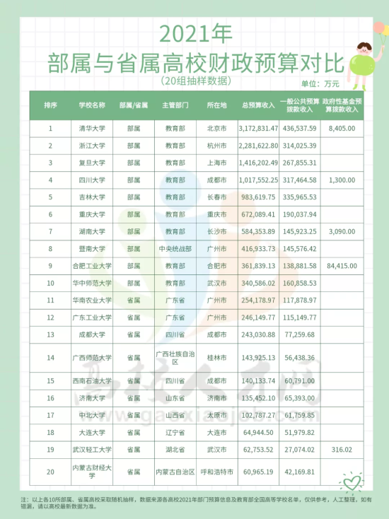 从上述数据我们可以明显看出,部属高校相较于省属高校,在财政预算收入上更占优势。而拥有政府性基金预算拨款收入的,也大多是部属高校。