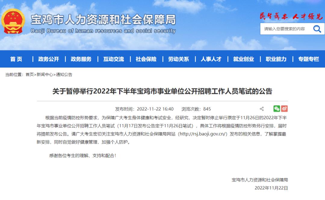 根据当前疫情防控形势要求,为保障广大考生身体健康和考试安全,经研究,决定暂时停止举行原定于11月26日的2022年下半年宝鸡市事业单位公开招聘工作人员笔试(11月17日发布公告定于11月26日笔试),具体工作将根据疫情防控形势另行安排,届时将提前发布公告。请广大考生密切关注宝鸡市人力资源和社会保障局网站()发布的相关信息,了解掌握最新安排,同时自觉做好健康管理,加强个人防护。