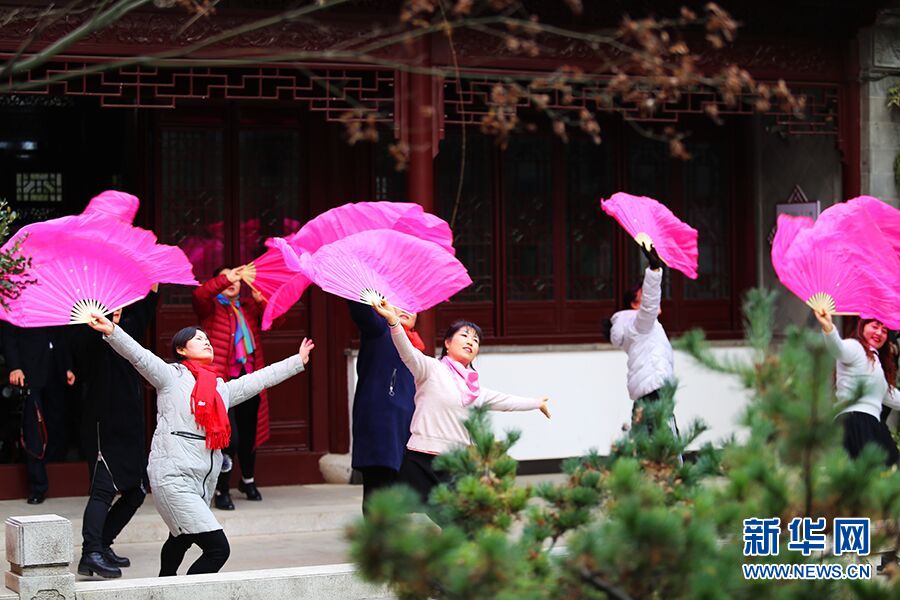 在东岭村“和园”广场,村民们正在排练扇子舞。新华网 杨喜龙 摄