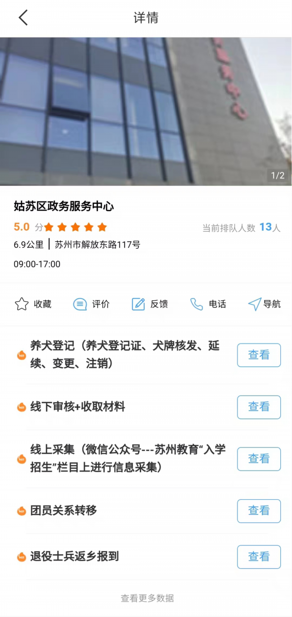 找到服务后,办事群众可以选择离自己较近的办理点,查看办事指南,还可以根据办理点排队情况提前预约,减少办事等待时间。