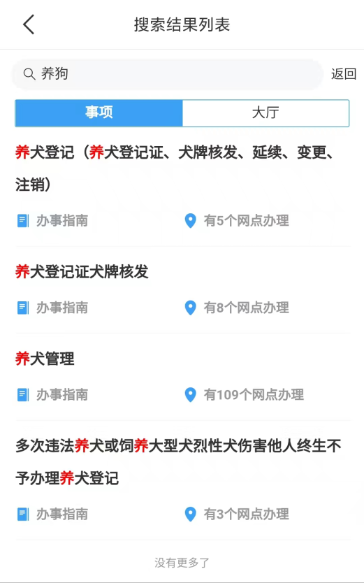 同时,为解决办事群众因不了解个别政务服务事项规范名称而无法找到相关服务内容的问题,数字地图对“民间称呼”和“规范名称”进行了匹配,比如,通过搜索“养狗”就可以找到“养犬登记”等服务。