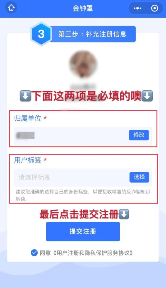 3.接着选择归属单位,选择用户标签,提交注册,系统提示“注册完成”后即被纳入“金钟罩”反诈系统保护。(提醒:归属单位是按定位推送距离您最近的社区,请一定要点选自己实际居住或工作地,这样注册成功后才能受到辖区警方的保护)
