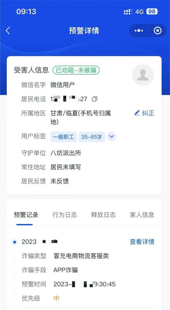 2023年12月9日,八坊派出所民警的临夏反诈“金钟罩”服务号接到突发事件预警信息:辖区的138******27机主有被诈骗的风险,请及时受理该劝阻任务。