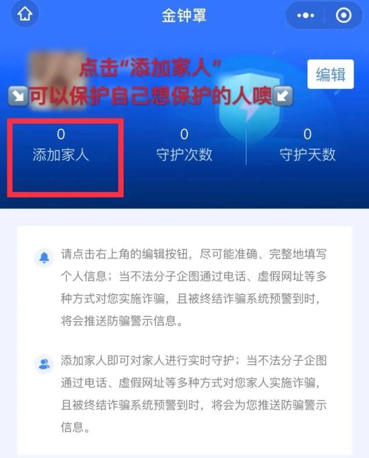 4.点击“添加家人”,添加成功后家人也会被纳入“金钟罩”反诈系统保护。