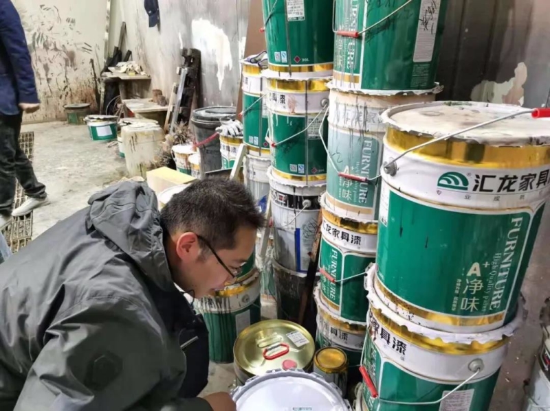 2021年4月,中央第一生态环境保护督察组在山西省运城市盐湖区现场检查某家具企业油漆使用情况。