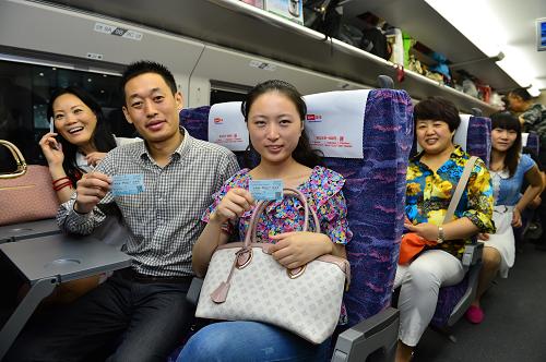 7月1日,几名旅客在西安北至太原南D2012次首发列车上展示车票。新华社发(唐振江摄)