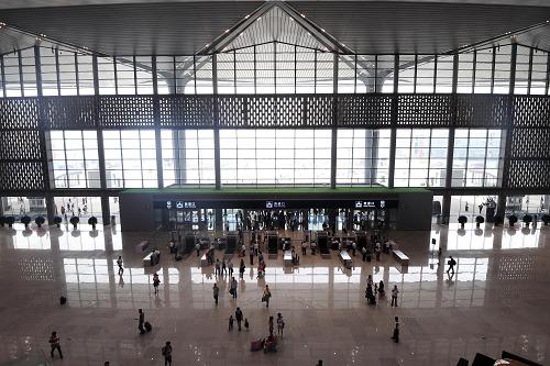 7月1日,在新建成的太原南站,乘客陆续进站。当日早8点50分,D2011次动车组列车从太原南站准时启动。大同至西安高铁(太原南至西安北段)正式开通运营。太原至西安的列车运行时间由原来的10小时缩短至3小时。新华社记者 范敏达 摄