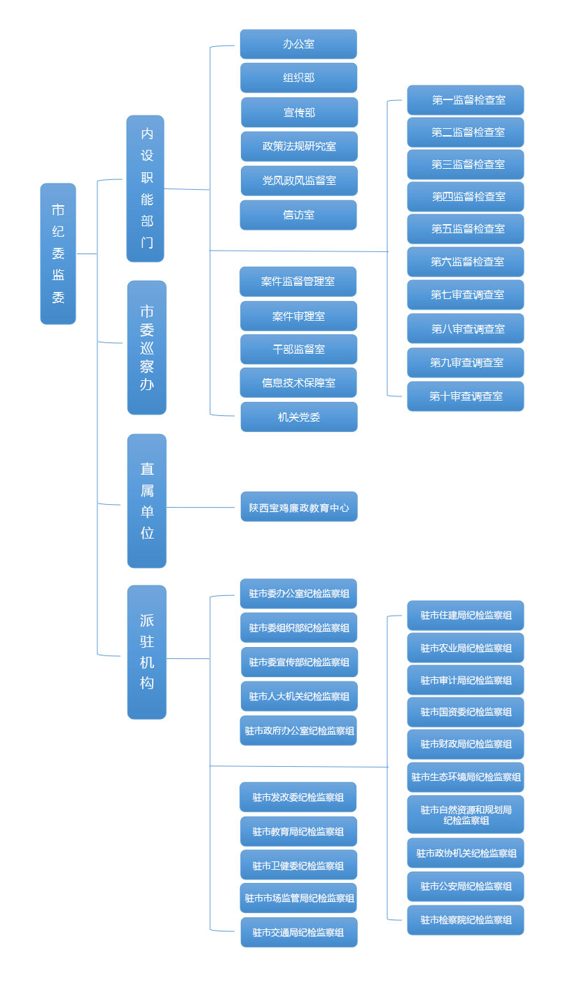 中共宝鸡市纪律检查委员会、宝鸡市监察委员会组织机构包括:内设职能部门、派驻机构和直属单位。内设职能部门具体为:办公室、组织部、宣传部、政策法规研究室、党风政风监督室、信访室、案件监督管理室、第一至第六监督检查室、第七至第十审查调查室、案件审理室、干部监督室、信息技术保障室、机关党委。直属单位为:陕西宝鸡廉政教育中心。市委巡察办列入市委工作机关序列,设在市纪委。