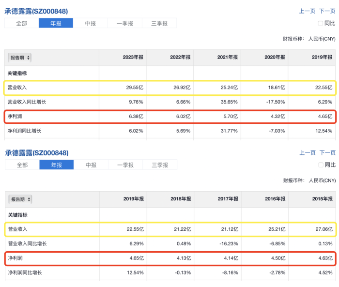 2023年,承德露露实现营业收入约29.55亿元,同比增长9.76%;净利润约6.38亿元,同比增长6.02%。2023年的营业收入和净利润水平都突破了2019年的水平,也成为其1997年上市以来最高水平。