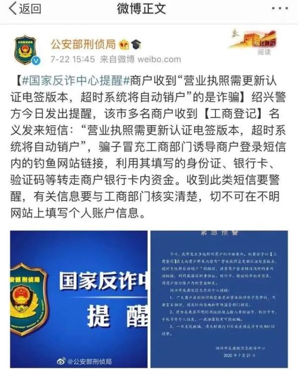 这类诈骗与之前的假冒外卖平台升级诈骗、假冒ETC诈骗相同,本质上都是钓鱼网站诈骗。骗子首先通过大量发送短信的方式广泛撒网,他们利用企业老板或个体商户怕生意受影响的心理,以“营业执照系统更新”为由诱骗企业老板或个体商户点击短信中的网站链接。一旦有人相信了短信内容并点击链接,就会跳转到骗子早已准备好的钓鱼网站,被套取身份证、银行卡等个人信息,或在手机中趁机植入木马程序,来偷取通讯录、支付宝、银行卡密码等重要个人信息,进而转走受害人的钱。