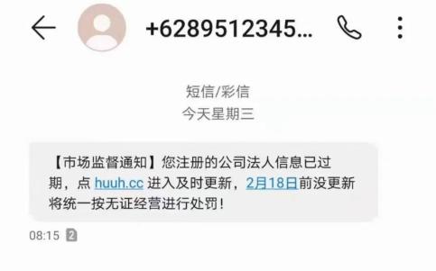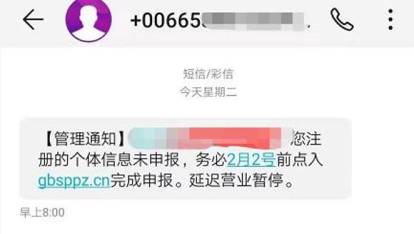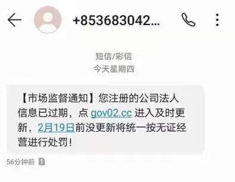 7月18日,宁波的夏女士收到了一条0085******发来的内容为“工商登记,由于营业执照系统更新为电子版本,请点击a.zhi*****立即更新认证,超时系统将自动销户,营业执照将无法使用。”的短信。
