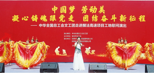当天上午,全总文工团还分别在西凤酒厂、陕西关环麟法高速公路建设项目工地进行了慰问演出(见上图),下午在市工人文化宫举行了声乐培训。