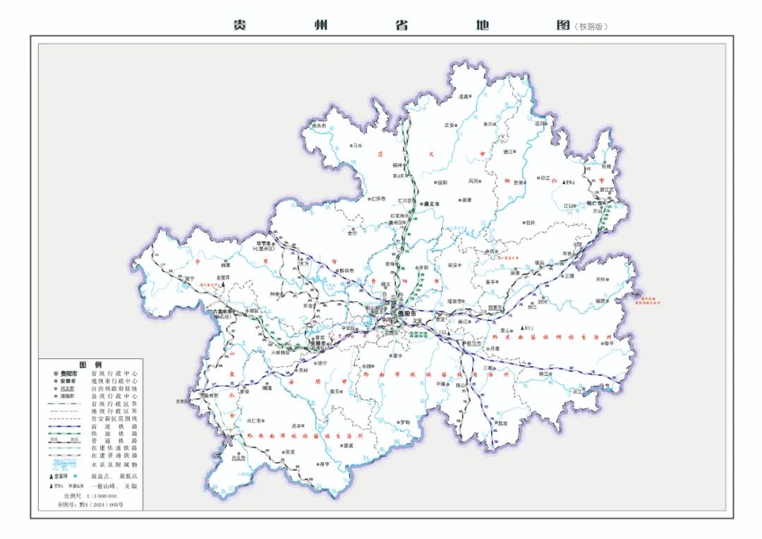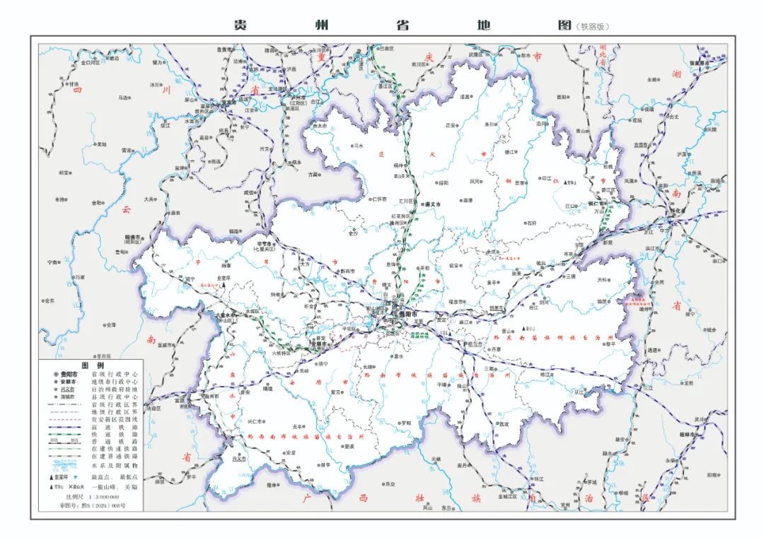 采用最新行业数据,及时进行2024版《贵州省标准地图》重点地图要素更新,并首次将在建工程项目标注上图,彰显编制前瞻性。其中,2023年9月全线贯通的渝筑高速、2024年1月全线贯通的筑蓉高速实现了及时上图、即时更新。2021年11月开工预计2025年竣工的在建纳晴高速,2021年开工建设的在建盘兴铁路提前纳入设计编制,展现工程线路走向,表达内容更完整,现势性更强。