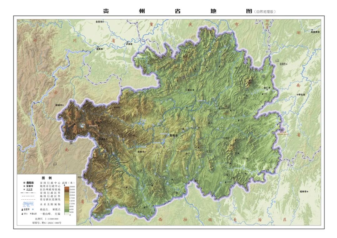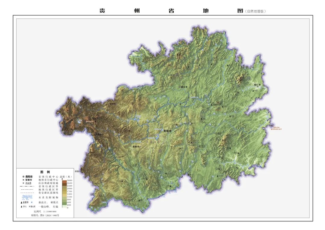 2024版《贵州省标准地图》发布了以立体地貌晕渲形式设计编制的自然地理有邻区、无邻区版主题图2幅,更为直观地展现了我省西高东低、三级台阶、山脉走向、流域分布等地形特点,为政府决策、行业规划、资源配置、产业布局、科学研究等工作提供准确的用图参考。