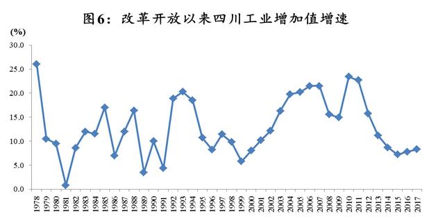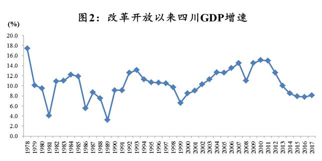 改革开放以来,四川经济共经历了6个经济增长周期,1978~1981年为0.5个周期,1982~1986年为第2个周期,1987~1989年为第3个周期,1990~1999年为第4个周期,2000~2008年为第5个周期,2009~2016年为第6个周期。四川经济周期和增幅升降既与全国大势基本一致,也具有鲜明的四川特点,显示出克服重大地震灾害影响的勇气、熨平经济阶段性变化的干劲和夯实长期平稳运行的智慧。其中,西部大开发以来,四川经济曾连续12年(2002-2013年)保持两位数快速增长,尤其是汶川地震三年灾后恢复重建期间(2009-2011年)GDP分别比上年增长14.5%、15.1%和15.0%。新常态下,四川经济逐步从高速增长转向中高速增长,经济增幅有所放缓,但保持高于全国的平稳较快增长。按可比价格计算,1979-2017年四川经济年均增长10.2%,增速比全国平均水平高0.7个百分点。