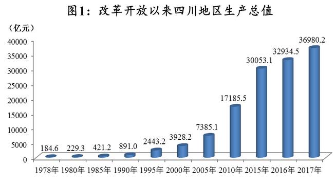 改革开放为四川经济插上了腾飞的翅膀,40年间,四川经济总量实现了从百亿到千亿再到万亿、甚至三万亿的历史性跨越。1978年地区生产总值仅为184.6亿元,1991年经济总量达到1061.3亿元,用13年时间实现了从百亿到千亿的跨越。2000年以来,随着国家两轮西部大开发战略的深入实施,四川经济步入发展快车道,2007年经济总量首次突破万亿,达到10562.4亿元,用16年时间实现了从千亿到万亿的跨越;2011年、2015年分别用了4年时间先后跨越两万亿和三万亿两个万亿台阶,2017年GDP总量达36980.2亿元,按不变价计算是1978年的44.8倍,超过改革开放到西部大开发前23年经济总量的总和。今天,四川经济每一天创造的经济总量超100亿元,超过了改革开放初期半年的经济总量。