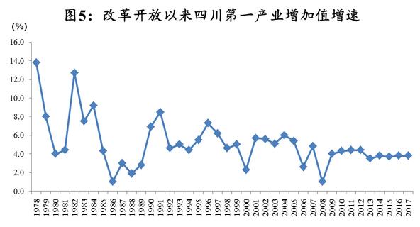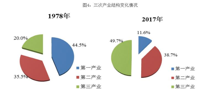 产业结构调整优化。从党的十一届三中全会召开到1982年党的十二大召开,四川率先在全国取得农村改革和城市经济体制改革的突破,实行家庭联产承包责任制,农业经济发展加快。1978年,第一产业增加值占GDP的比重为44.5%,1982年占比进一步提升至45.5%,三次产业结构为45.5:33.8:20.7,呈现明显的“一二三”特征。随着所有制经济由单纯的公有制转变为多种所有制并存,非农产业加快发展,第一产业比重进一步降低,1991年三次产业结构调整为33.4:37.0:29.6,呈现“二一三”特征,第二产业成为四川经济的支柱产业。1995-2000年间,服务业增速连续6年高于第二产业增加值增速,1999年服务业增加值占GDP的比重提升至37.6%,三次产业结构调整为25.4:37.0:37.6,实现了第一次的“三二一”结构转型。西部大开发后突出工业主导以及工业强省战略的实施,工业经济加快发展,2005年三次产业结构调整为20.1:41.5:38.4,2011年第二产业增加值占比进一步提升至47.8%,比第三产业占比高9.6个百分点。经济进入新常态以来,四川主动引导和推动经济结构战略性调整,经济增长实现了从主要依靠工业带动转为工业和服务业共同主导,经济结构呈现重大变化,2016年服务业比重超过第二产业,成为经济发展新引擎。2017年,三次产业结构调整为11.6:38.7:49.7,第一产业比重比1978年下降32.9个百分点,第二、三产业比重分别提高3.2和29.7个百分点。